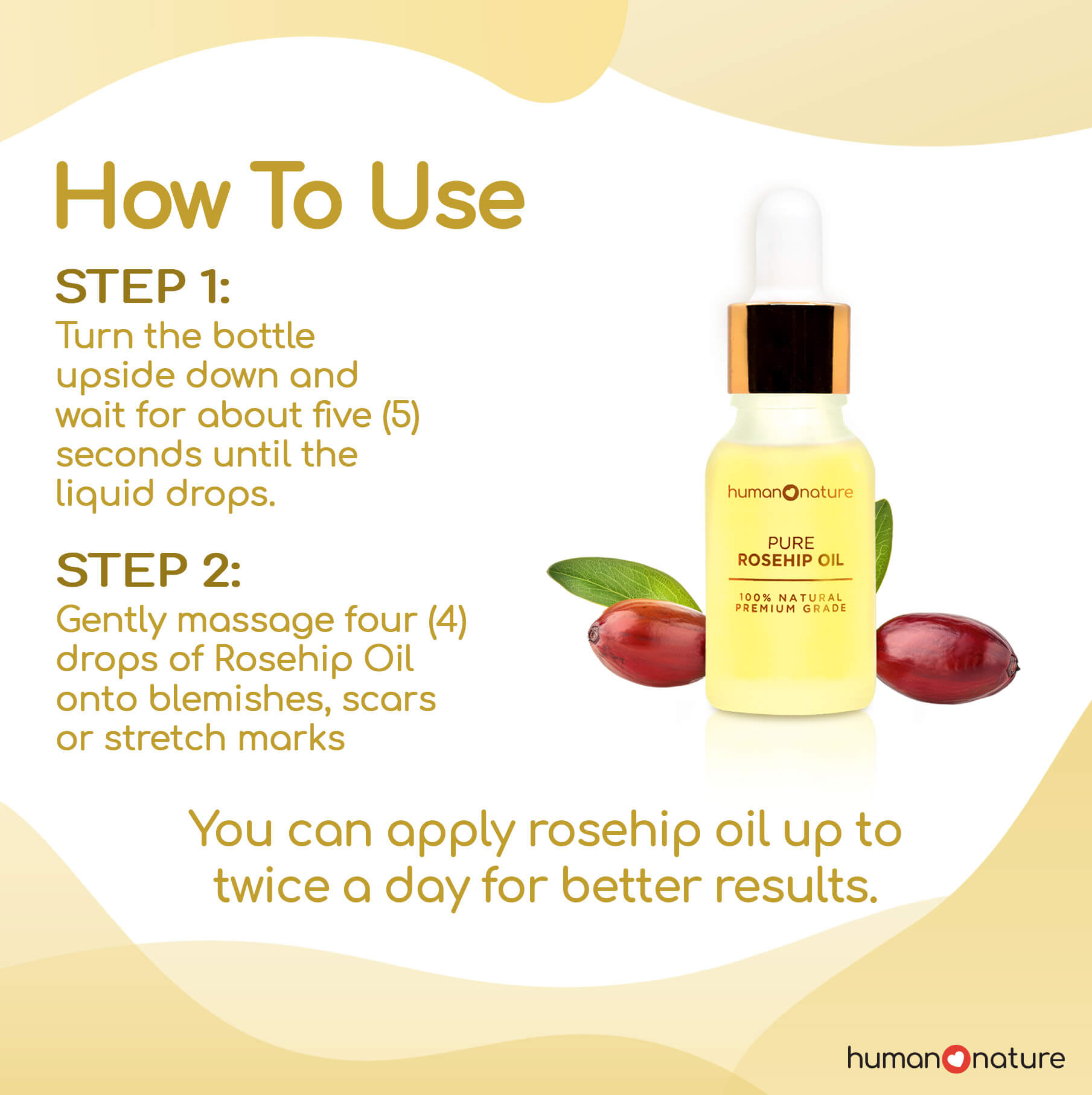 HOW TO USE: Turn the bottle upside down and wait for about five (5) seconds until the liquid drops. Gently massage four (4) drops onto blemishes, scars or stretch marks.